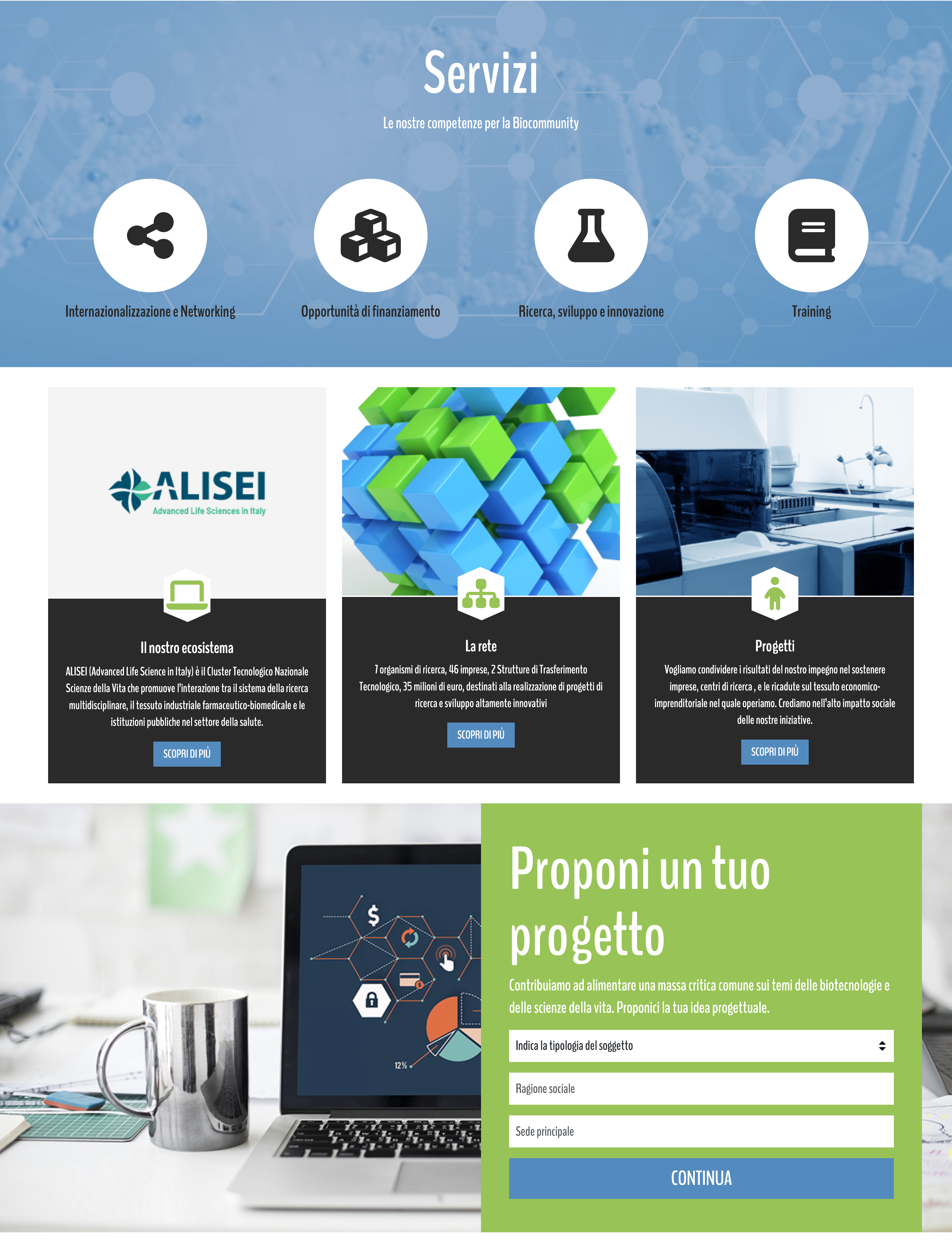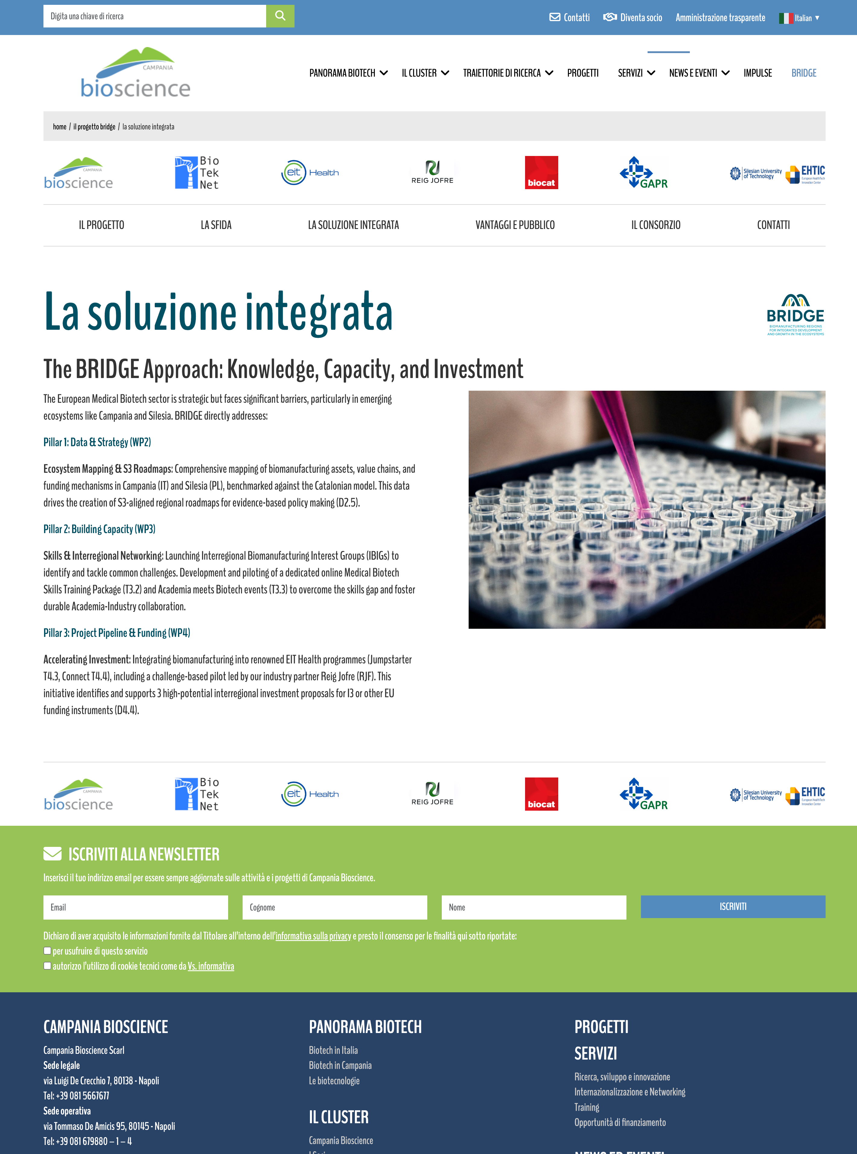 In questa seconda fase abbiamo esteso il sito esistente, trasformandolo in un sistema capace di generare e ospitare nuovi progetti in modo strutturato. Abbiamo realizzato una piattaforma che consente a Campania BioScience di attivare una nuova area progetto con un’impostazione già pronta, mantenere coerenza grafica e di navigazione con il sito principale, presentare contenuti, aggiornamenti e risultati in modo ordinato e supportare la collaborazione e la comunicazione con partner esterni.